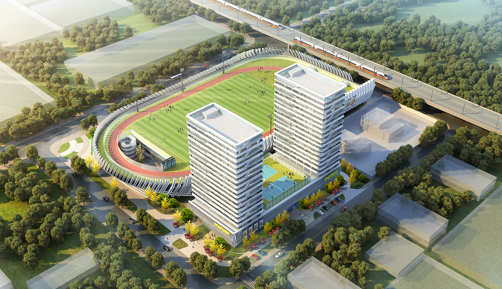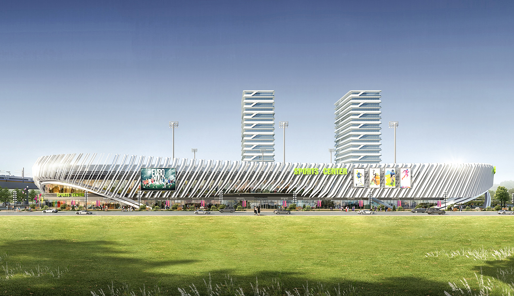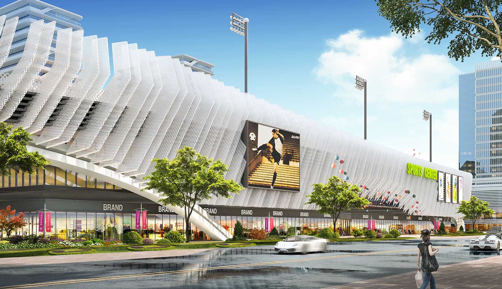 本項(xiàng)目提取高鐵動車和海浪浪花的概念,用白色鋁板陣列與變化塑造出體育綜合體泛著浪花的海洋波浪造型。同時(shí)利用動車動感流線的造型設(shè)計(jì)出公寓的整體方案。海浪與動車流線結(jié)合,不僅代表了青島的特色,更是詮釋了積極動感的體育精神。將景觀引入建筑,以景觀打造形象,形成未來綜合體發(fā)展模式。
