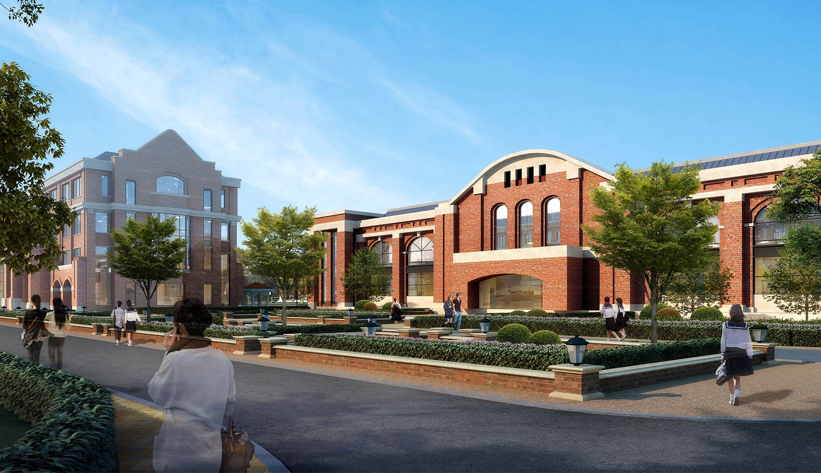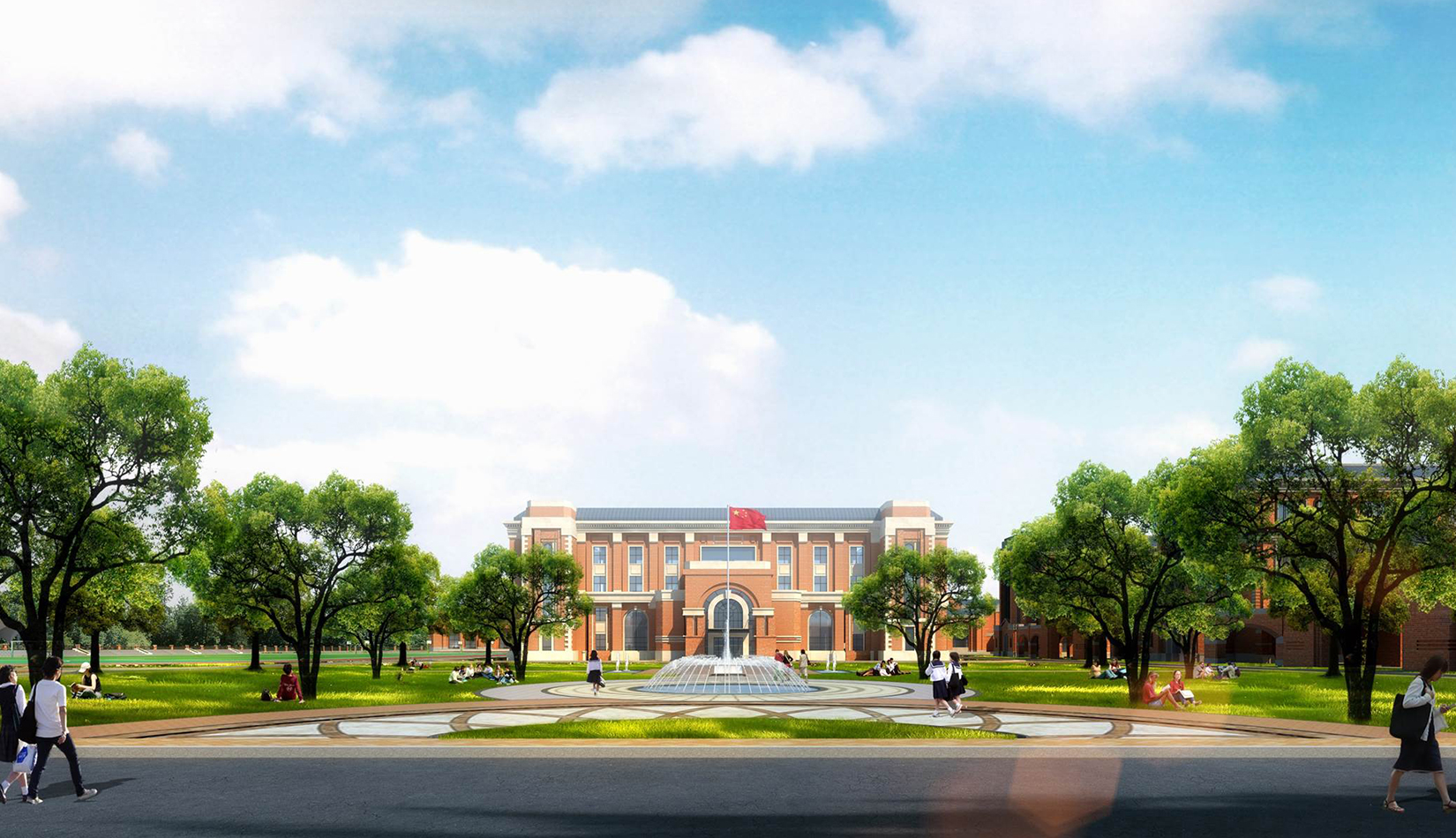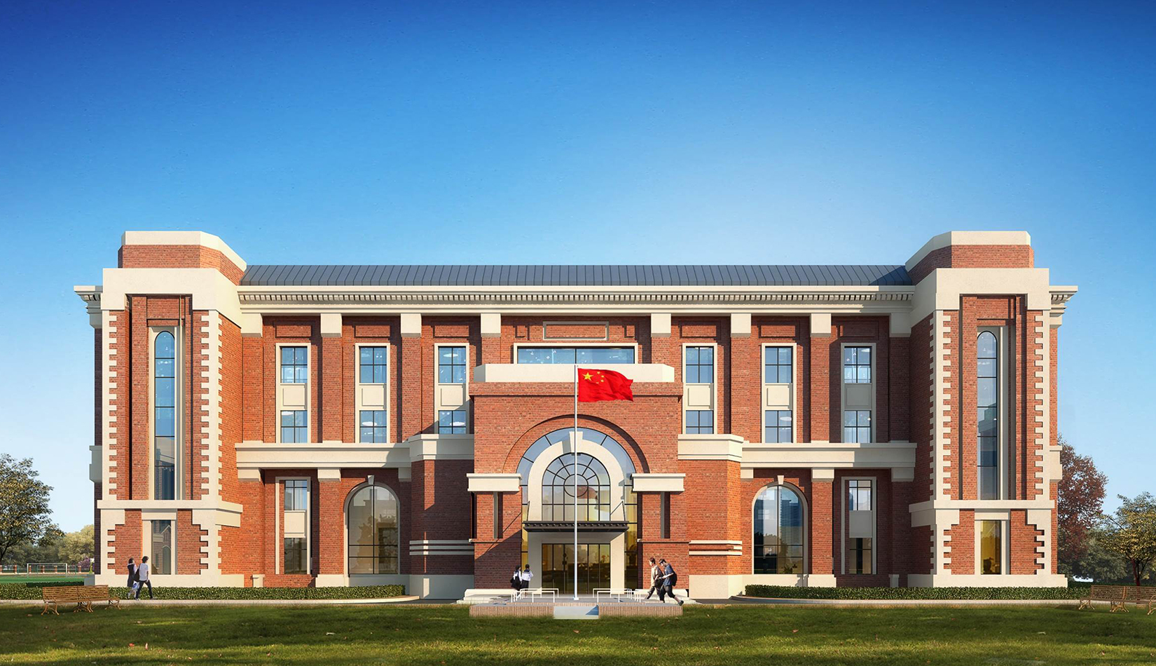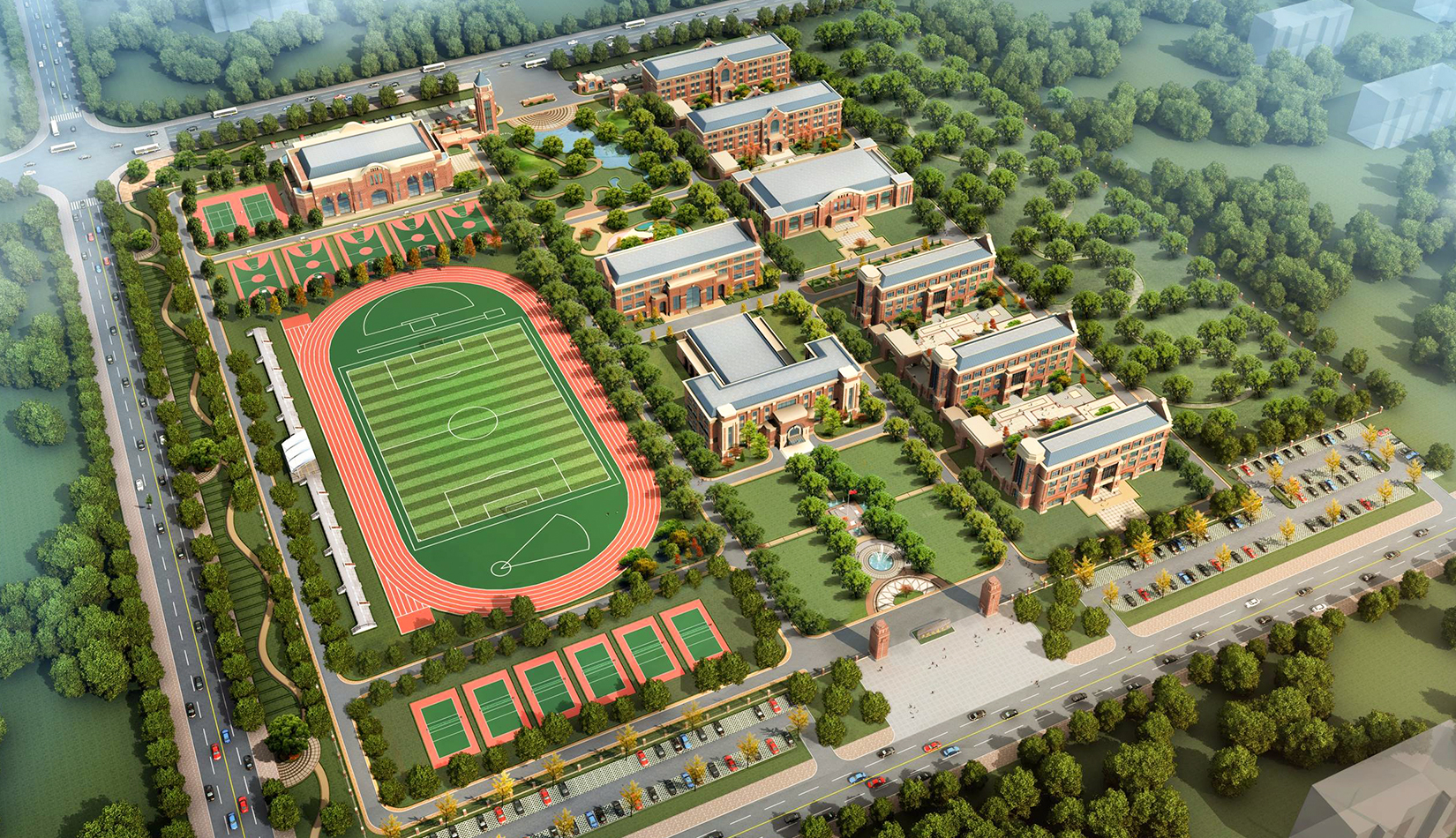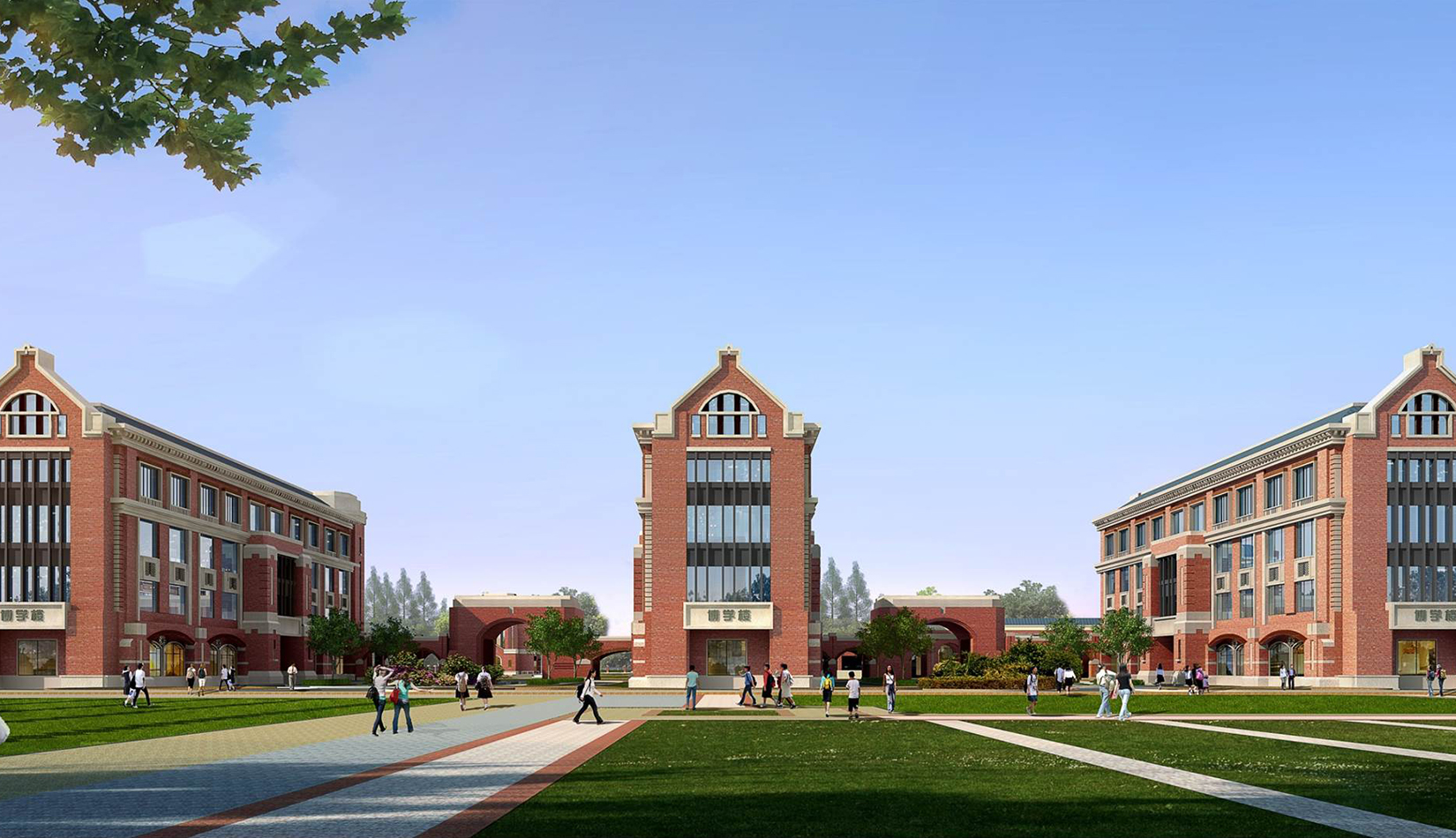 分區(qū)設(shè)計(jì)上,采用了“前場(chǎng)后園”的設(shè)計(jì)手法。前區(qū)以教學(xué)區(qū)為主,圍繞中心圖書綜合樓形成前區(qū)禮儀性廣場(chǎng),同時(shí)以中軸對(duì)稱為原則,體現(xiàn)了教學(xué)的嚴(yán)肅性與秩序性;各個(gè)教學(xué)單元以年級(jí)、功能就近布置為基本原則,以中國(guó)傳統(tǒng)的“院落”形式進(jìn)行組合,后院生活區(qū)借鑒了“山水園林”的布局手法,結(jié)合中心景觀,進(jìn)行自由化布局,達(dá)到景入園中、人在景中生活場(chǎng)景,使學(xué)生在學(xué)習(xí)之余,得到充分的放松。
