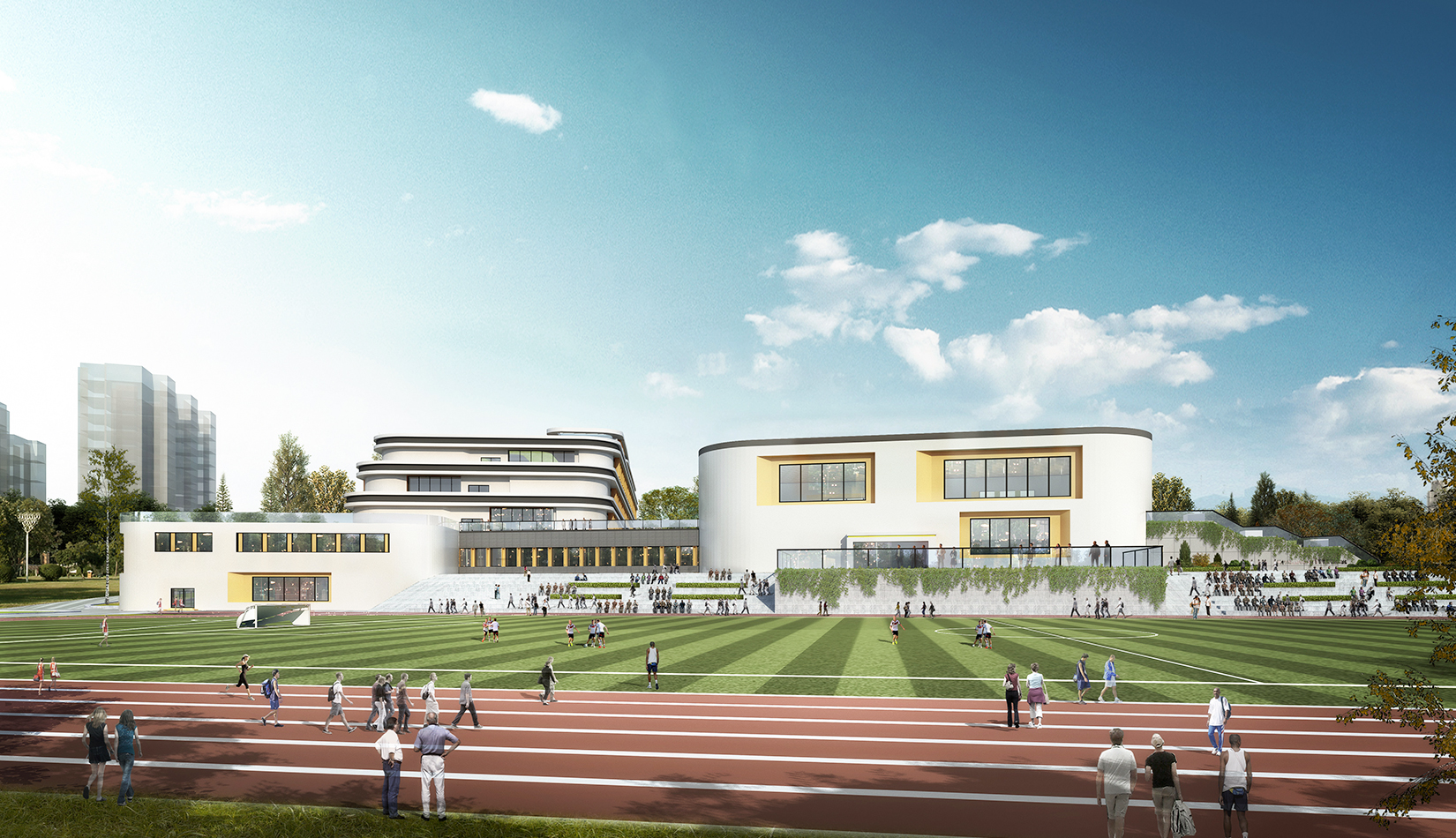 該項目設(shè)計打破傳統(tǒng)的班級串聯(lián)式學(xué)校模式,植入聯(lián)系各個功能區(qū)的中庭大空間,使用者一旦進(jìn)入,即可到達(dá)任一功能區(qū);同時該中庭大空間又是學(xué)生之間、師生之間、及學(xué)生家長們的公共自由開放式交流會面空間。