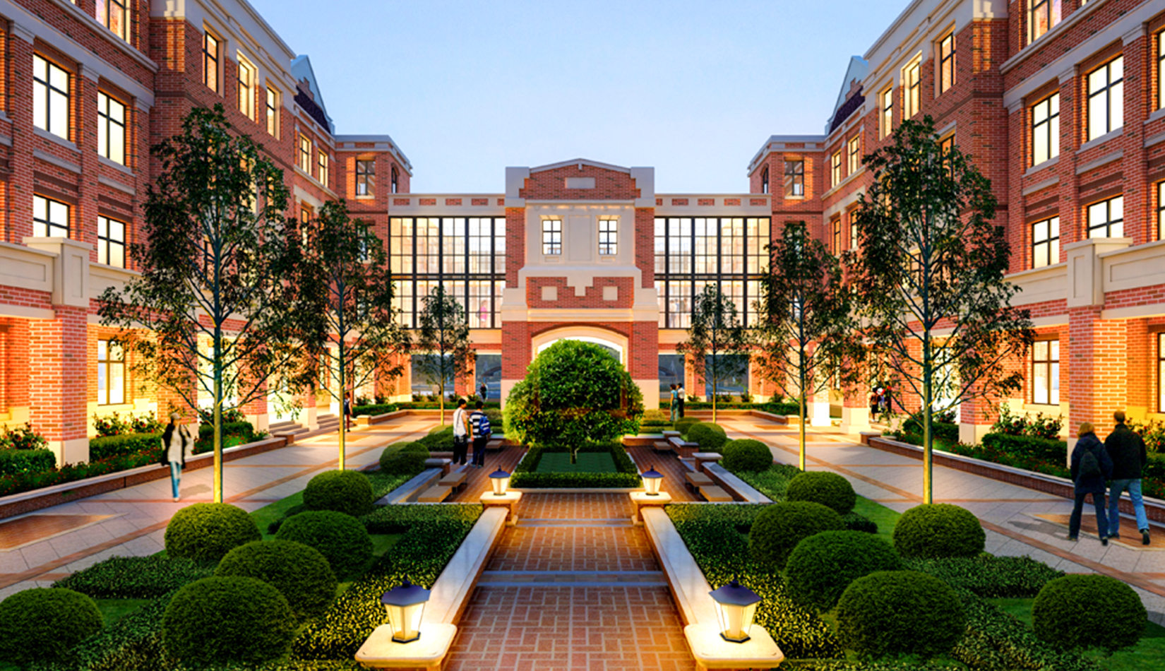 學(xué)院派的院落空間布局: 規(guī)整的建筑軸線(xiàn)布局,古典的建筑界面,方整的院落交流空間,結(jié)合廣場(chǎng)、綠地,營(yíng)造百年學(xué)府的低調(diào)。