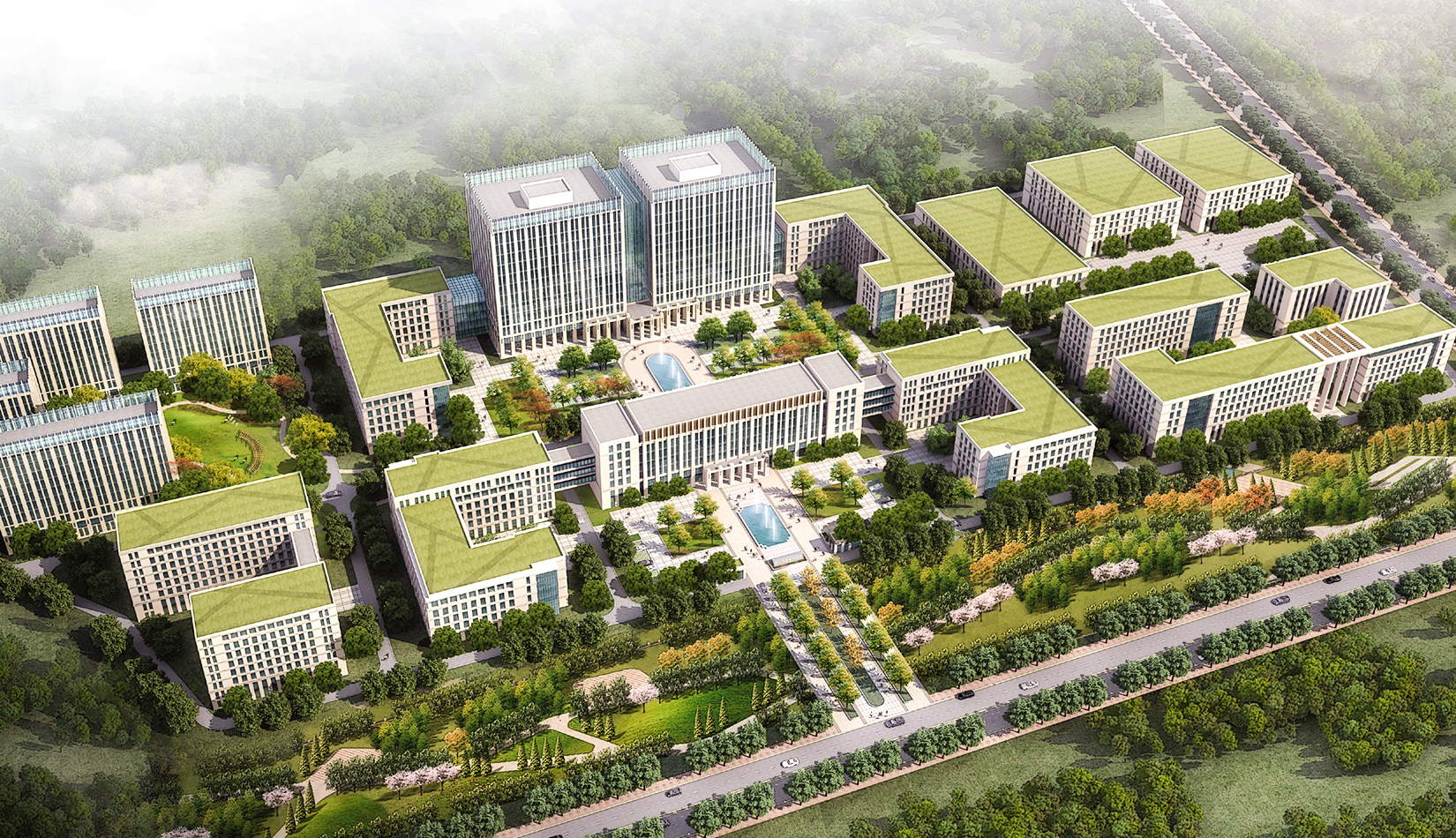 基地位于山東省青島市黃島區(qū)顧家崖頭村以東,濱海支路道路紅線以西,大學(xué)一路以北區(qū)域,占地面積10 萬平米。本著功能至上的布局原則,結(jié)合庭院方案按照功能分為五個區(qū)域:公寓區(qū)、辦公區(qū)、廠房區(qū)以。辦公區(qū)為整個園區(qū)的中心,占據(jù)基地最重要的中心地帶;公寓區(qū)位于基地西側(cè)相對比較安靜的地塊;廠房區(qū)既要有相對便捷的交通出入口,同時又不能影響整體園區(qū)的沿街立面,因此廠房區(qū)位于整個基地的東北角,這樣的一個功能分區(qū)可以有效的組織人流,使功能更加合理。