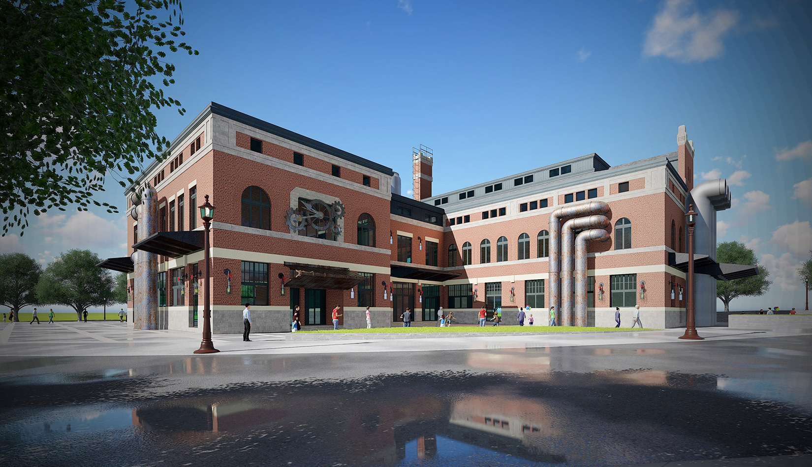 本案提取傳統(tǒng)歐洲工業(yè)建筑的構(gòu)成比例與細(xì)部構(gòu)造,立面采取傳統(tǒng)的兩段式,與周邊建筑群落相融合。