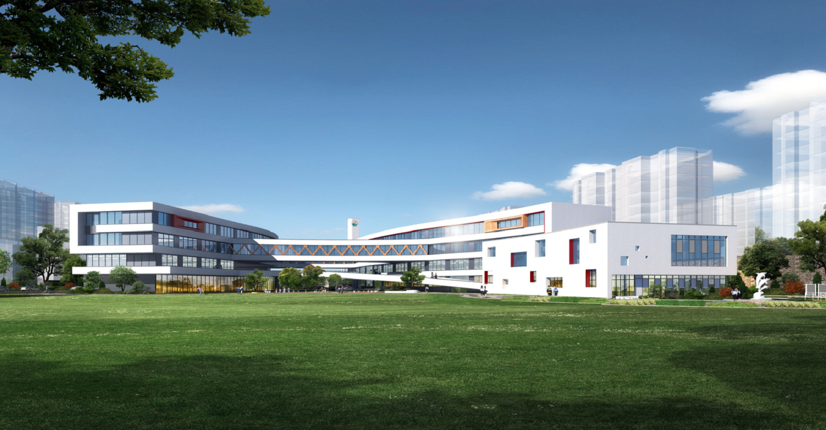校園規(guī)劃采用曲線手法,營造流水姿態(tài),將東側(cè)山脈與西側(cè)河流連接在一起。設(shè)計現(xiàn)代化“山水”校園,使學(xué)生在自然中成長。營造活水發(fā)源的“源頭”意境,寓意教育為人類文化長河的源頭,呼應(yīng)學(xué)?!霸搭^”文化。曲線舒展的形體,整體采用白色色調(diào),局部以紅黃色進(jìn)行點綴,風(fēng)格純潔又不失活潑。